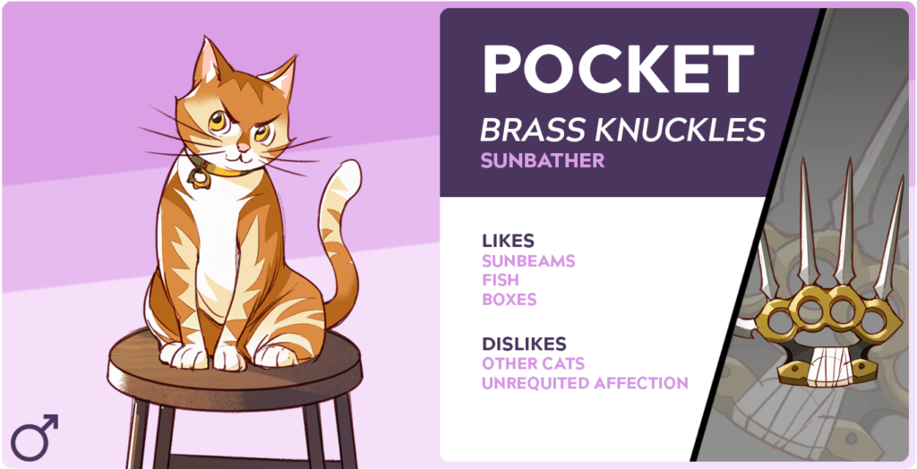 Pocket is one of the dateable weapons in Boyfriend Dungeon. He is a sunbather, and transforms into Brass Knuckles, and a cat. The player meets him in La Rosa on Floor 2.